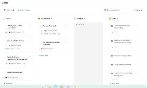 The Board view provides a Kanban-style layout, allowing you to move tasks through stages such as “To-do,” “Blocked,” and “In Progress.” This gives you ultimate visibility, showing you at a glance where your bottlenecks are, what’s on the list for today, and what’s waiting for you in the future.