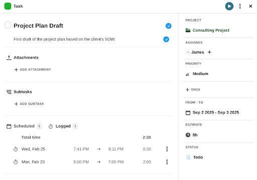 Built on the foundations of Toggl Track (which many consultants already use), Toggl Focus makes sure you never have to guess how long tasks take; your plans are based on real-time data. You can track time in many ways, including through the browser plugin or in-app timers.