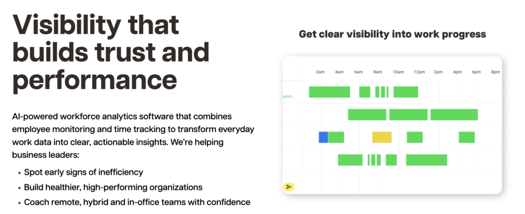 - Stay clear of employee monitoring software. Instead, it uses time data to build cultures of trust, transparency, feedback, and growth.