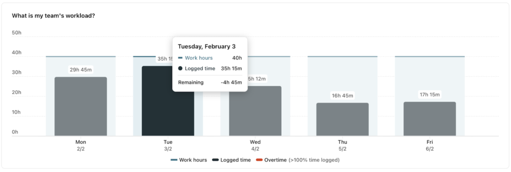 - Workload reports that provide an at-a-glance overview of your team’s progress toward weekly targets, so you can see who’s working overtime or available to handle extra tasks.