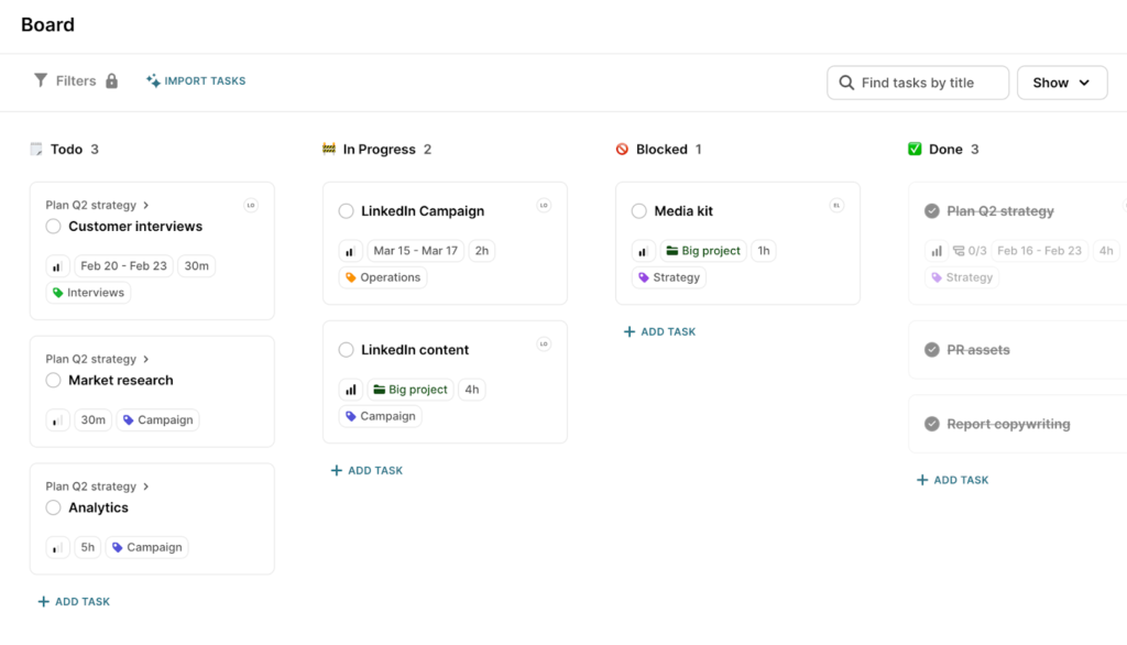 For example, a marketing team can plan campaigns on a timeline, execute daily work in a Kanban board, and log billable hours without switching screens (or paying for extra tools).