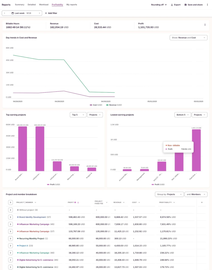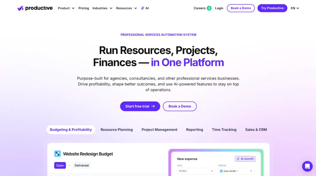 | Productive | Agencies optimizing profitability and operations | 14-day trial | $10/user/mo | Built-in budgeting Revenue forecasting CRM features |