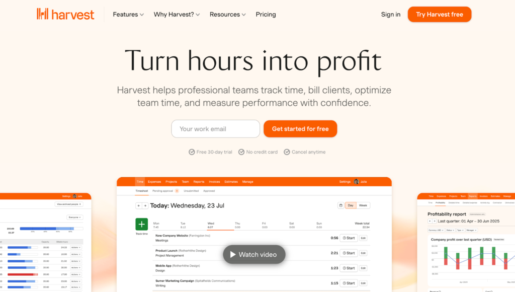 | Harvest | Simple client invoicing | Free plan + trial | $9/user/mo | Faster invoicing workflows Automatic data sync to accounting apps Expense management |