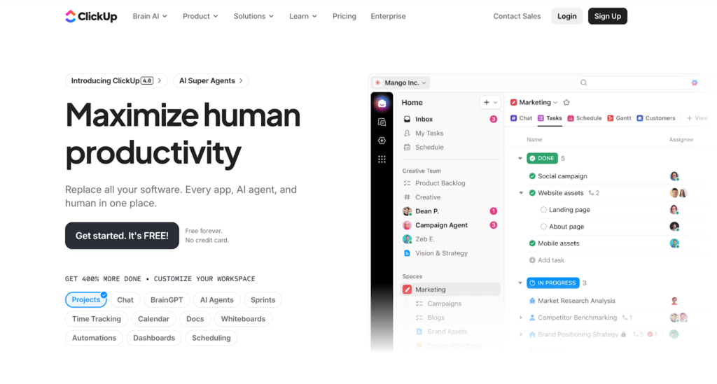 | ClickUp | Custom workflows and automation | Free plan + trial | $7/user/mo | Highly customizable workflows Automation and AI features Broader collaboration tools |