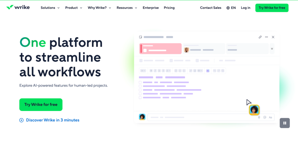 | Wrike | Large teams needing governance and reporting | Free plan + trial | $10/user/mo | Enterprise-grade reporting and access permissions Workflow automation |