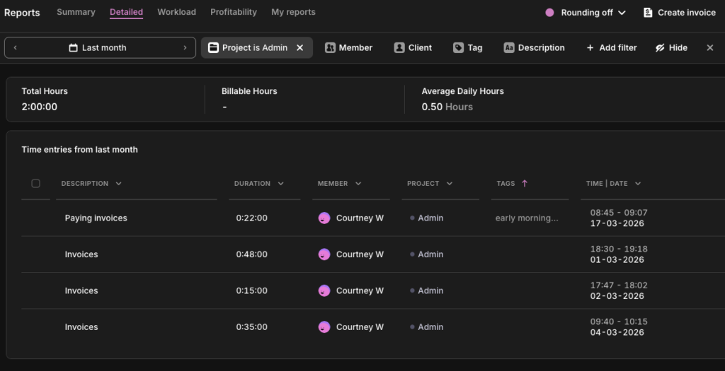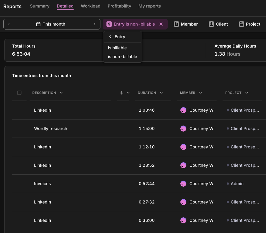 In Toggl Track: Tag non-billable entries by type, such as ‘admin,’ ‘internal meetings,’ ‘training,’ etc., and view the breakdown in the Summary Report. Over time, you’ll see whether your overhead is being invested or merely absorbed.