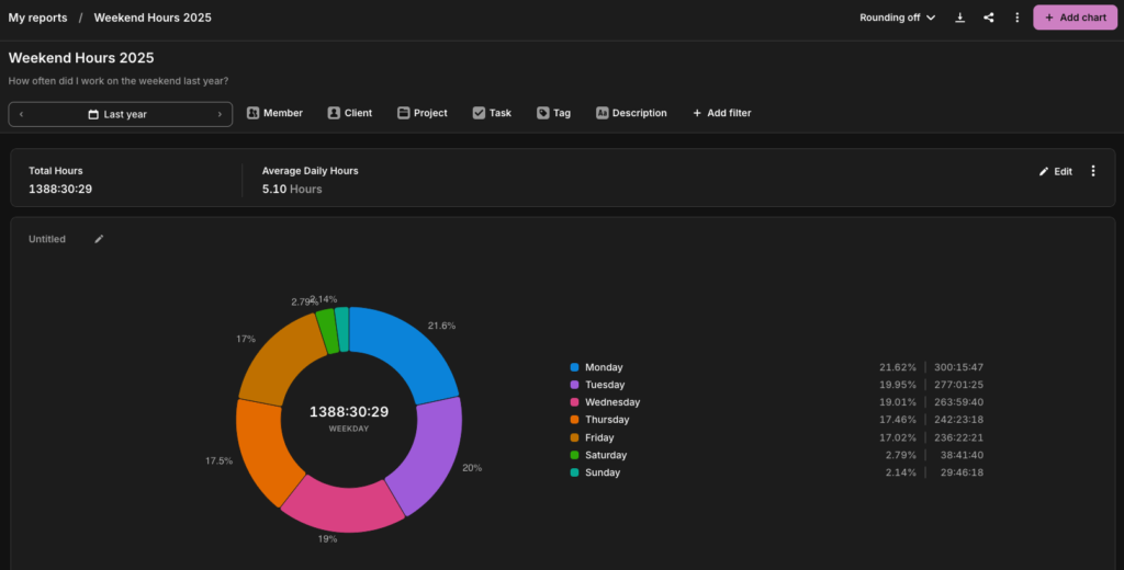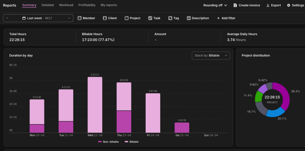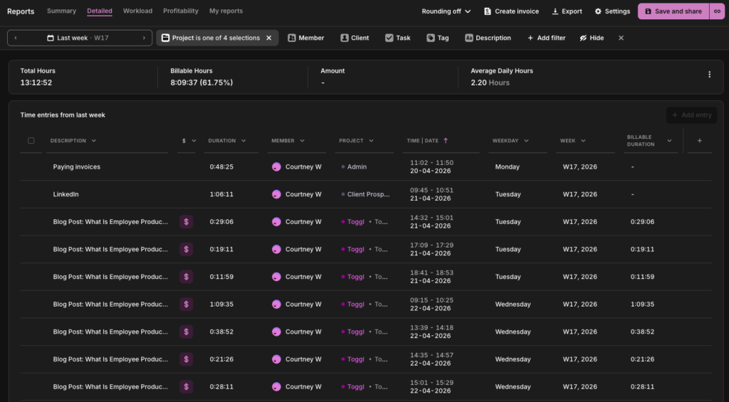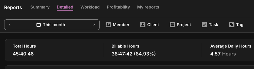 Monthly reviews are too infrequent to catch problems before they compound. A 15-minute weekly review of a few of Toggl Track’s reports is more useful than a monthly all-hands with three-week-old data.