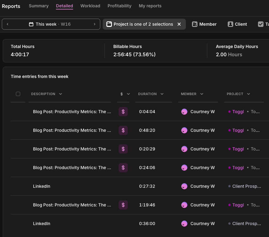 In Toggl Track: You can use Toggl’s profitability reports to see revenue generated by specific team members against their labor costs.