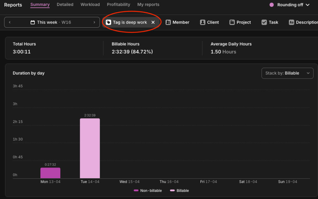 In Toggl Track: Tag time entries as ‘deep-work,’ ‘meetings,’ or ‘admin,’ and view the breakdown in the Summary Report. The act of tagging itself tends to make people more intentional about where their time goes.
