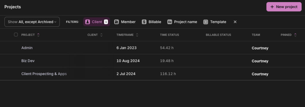 In Toggl Track: Use Toggl’s Project Dashboard to compare estimated hours against actuals for each project. A project that closed within its time estimate and didn’t require scope expansion is your baseline for “on time and within scope.” You can also filter by date range to track completion rate across quarterly or annual billing cycles.