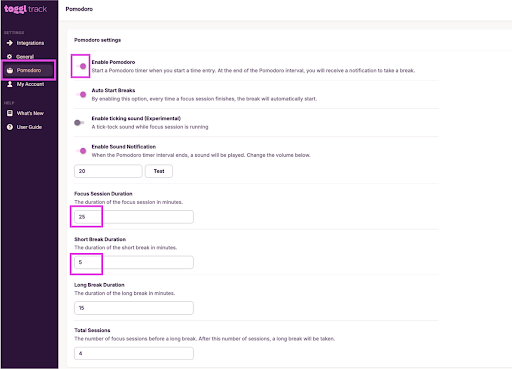 From the Toggl Track Chrome Extension, head to settings. Enable Pomodoro and customize your work and break intervals.