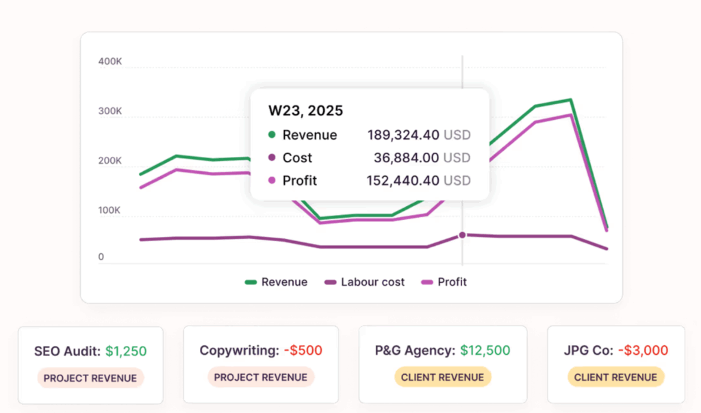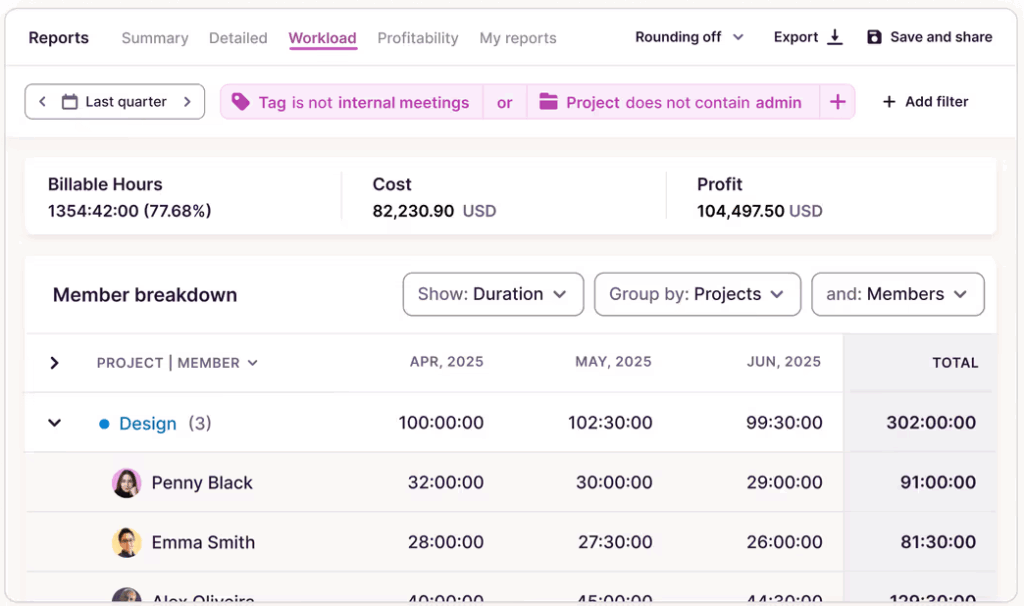 Toggl Track’s Profitability Report shows you exactly where your largest profit margins come from, so you can double down on those relationships and adjust pricing or allocated time on the rest.