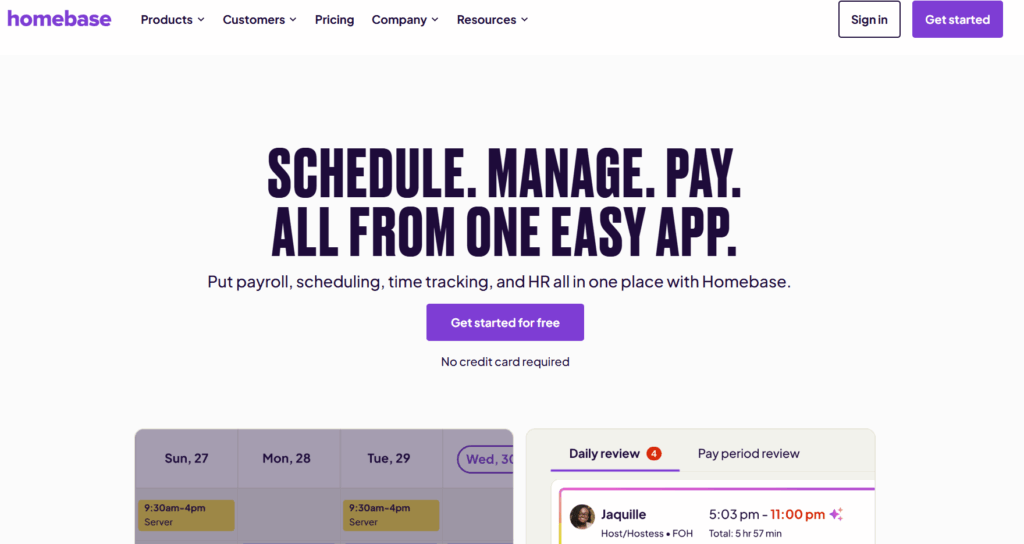 Homebase positions itself as an “everything app” for team management, making it a great fit for retail businesses with hourly workers. Instead of focusing purely on time tracking, Homebase leans heavily into scheduling, hiring, and payroll for brick-and-mortar businesses.
