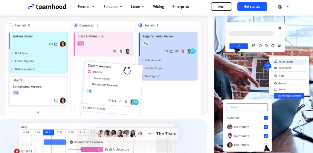 Teamhood is a visual project and workload management tool that combines Kanban-style workflows with workload views, Gantt charts, and native time tracking. It places a strong emphasis on flow-based work and realistic planning, which makes it particularly effective for teams balancing multiple jobs at different stages of progress.