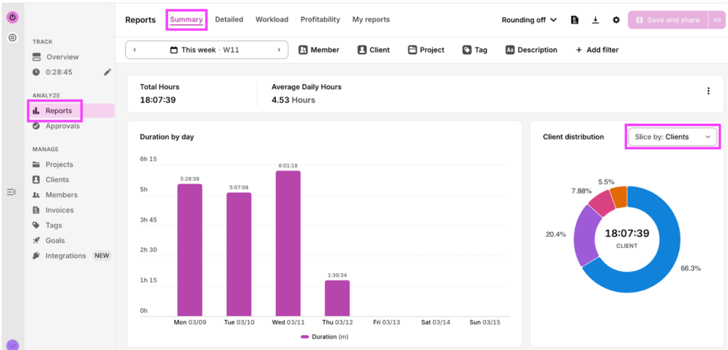 In Reports, select Summary and slice the pie chart by Clients or Projects, to see how you split your time across different demands.
