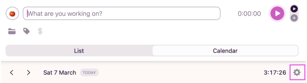 From the Toggl Track desktop app, go to the Calendar view and click Settings.