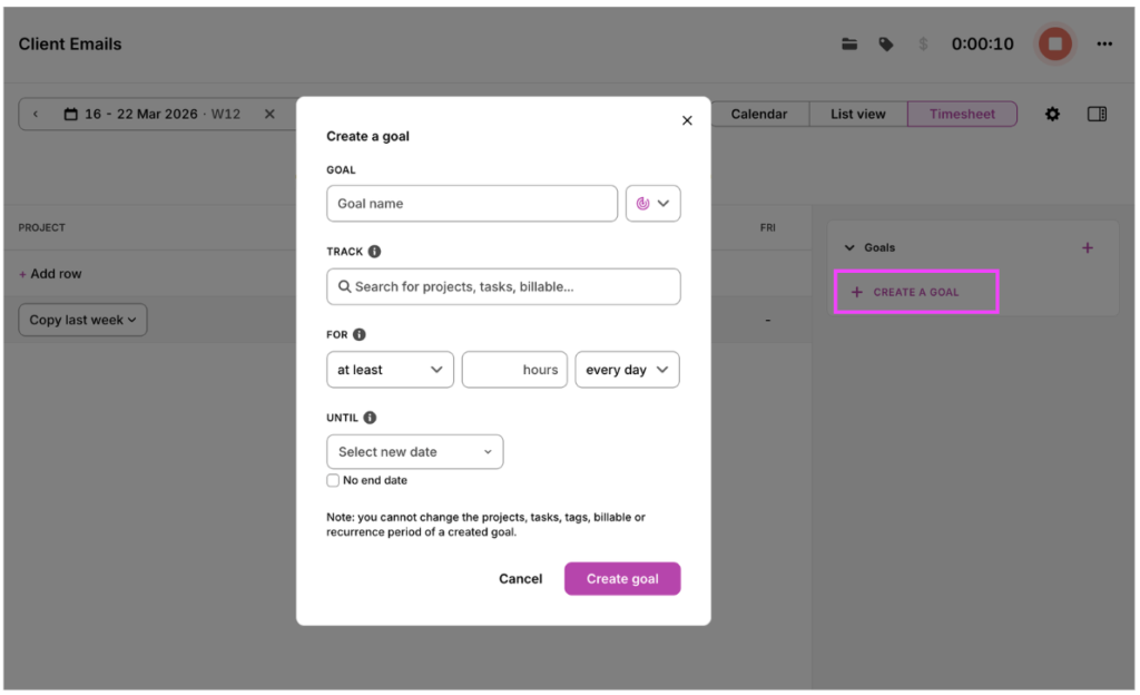 Create goals from within the timer page…