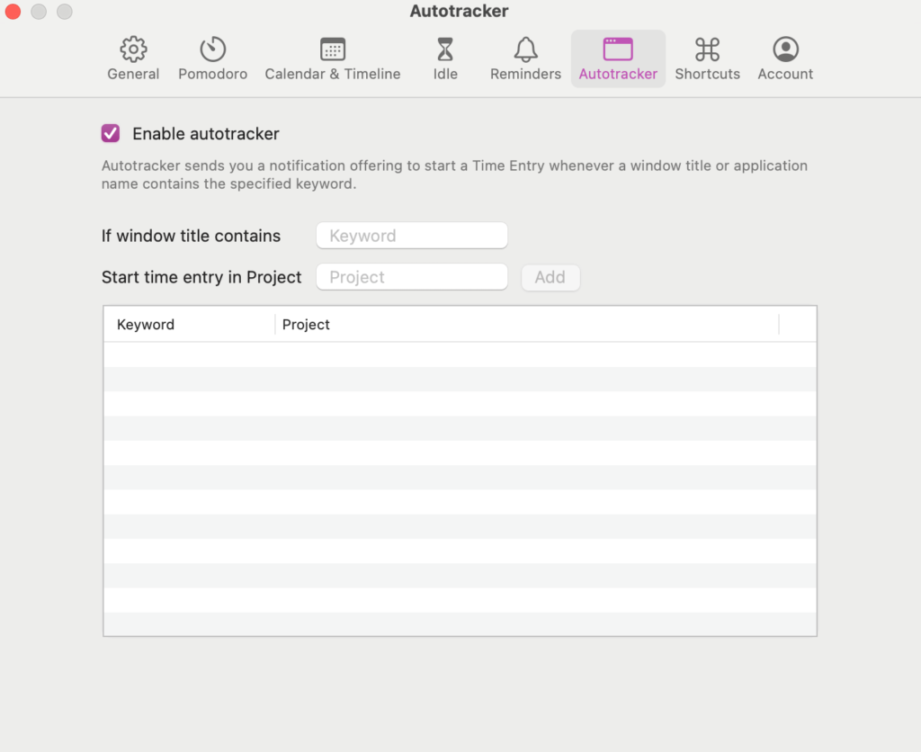 Click on the Autotracker tab, tick Enable Autotracker, and configure which webpages you want to map to which Projects.